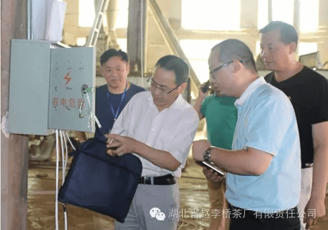 黃岡市經(jīng)濟責任審計局副局長吳秀峰(左二)正在檢查趙李橋復制線電改情況。左三湖北省趙李橋茶廠總經(jīng)理王冬陽