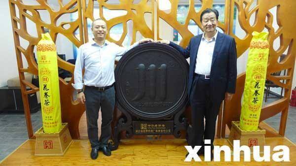11月6日,趙李橋茶廠董事長李勇(左)與中國茶葉流通協(xié)會常務(wù)副會長王慶(右)在“川”字牌巨型茶餅旁合影留念。