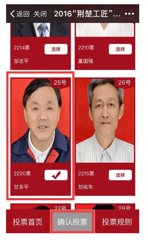 進(jìn)入投票頁(yè)面,選擇“25號(hào)”(甘多平)及其它隨意4人(必須滿5票投票才有效),并點(diǎn)擊“確認(rèn)投票”按鈕。即可完成投票。(每日均可投一票,投票時(shí)間2016年10月13日-10月28日)