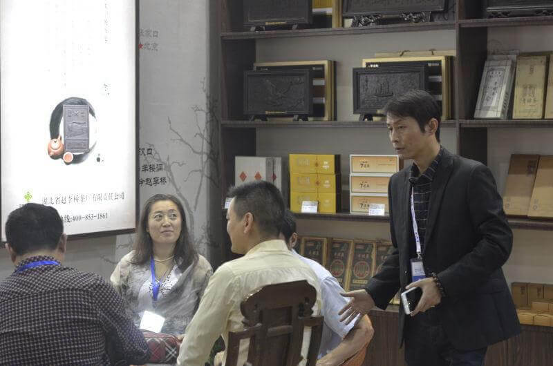 湖北省趙李橋茶廠有限責(zé)任公司作為青磚茶代表性企業(yè)以館區(qū)最大的特裝展館參展。早上9點(diǎn)開(kāi)館后。趙李橋茶廠展區(qū)客商絡(luò)繹不絕。