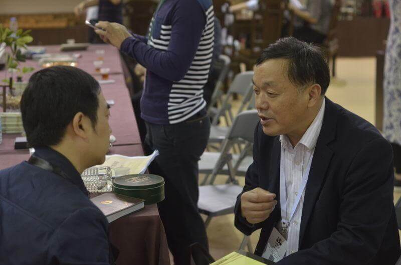 趙李橋茶廠營(yíng)銷部部長(zhǎng)羅進(jìn)啟(右一)與來(lái)展客商介紹趙李橋茶廠