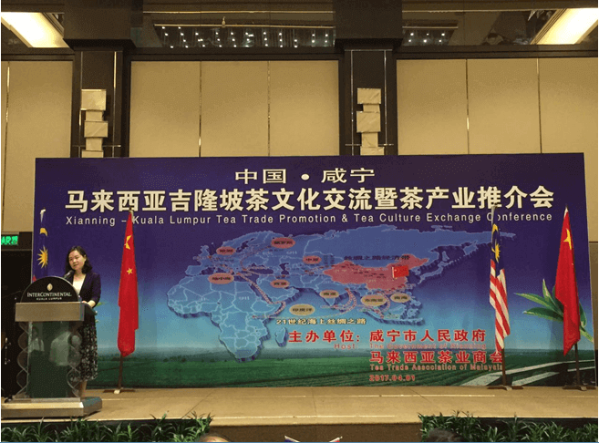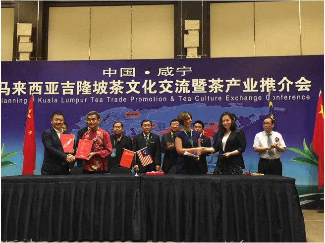 2017年4月1日,由咸寧市人民政府、馬來西亞茶業(yè)商會主辦、赤壁市和咸安區(qū)人民政府及咸寧外僑辦協(xié)辦、東盟中國經(jīng)濟(jì)貿(mào)易發(fā)展促進(jìn)會支持的主題為“茶文化交流暨茶產(chǎn)業(yè)推介會”在馬來西亞首都吉隆坡洲際大酒店隆重舉行。馬來西亞茶業(yè)商會會長劉俊光、咸寧市市長王遠(yuǎn)鶴、東盟中國經(jīng)濟(jì)貿(mào)易發(fā)展促進(jìn)會會長拿督吳國強、赤壁市市長李朝曙、馬來西亞國際貿(mào)易與工業(yè)第二部長、拿督斯里黃家泉、中國駐馬大使館商務(wù)處代表翟毅勃、中方茶企代表李云等與馬來西亞工商界各界人士及茶友匯聚一堂,現(xiàn)場分享了咸寧的特色產(chǎn)品----川字青磚茶,并以青磚茶為媒,實現(xiàn)跨境合作、友好交流取得圓滿成功。