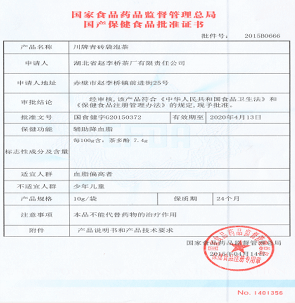 11月12日,湖北省趙李橋茶廠收到批件號為“201580666”、批準文號為“國食健字G20150372”的保健食品批準證書。