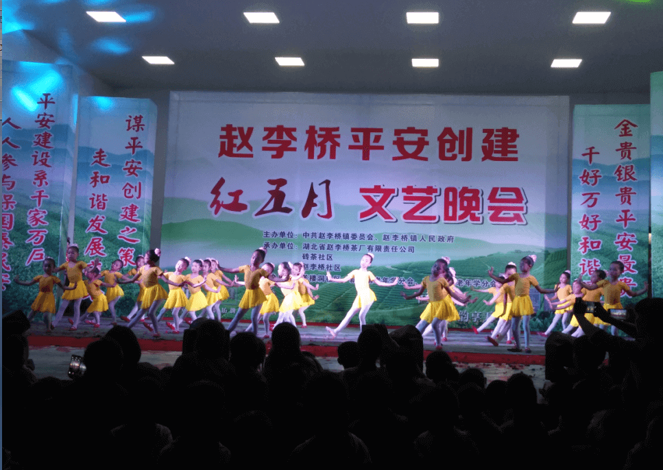 2017年5月4日晚,我們共聚一堂。由中共趙李橋鎮(zhèn)委員會、趙李橋鎮(zhèn)人民政府主辦,湖北省趙李橋茶廠有限責(zé)任公司、磚茶社區(qū)、趙李橋社區(qū)承辦,羊樓洞社區(qū)、新店鎮(zhèn)老年學(xué)分會、磚茶社區(qū)老年學(xué)分會協(xié)辦的“趙李橋平安創(chuàng)建 紅五月文藝晚會”在我公司燈光舞臺隆重舉行。