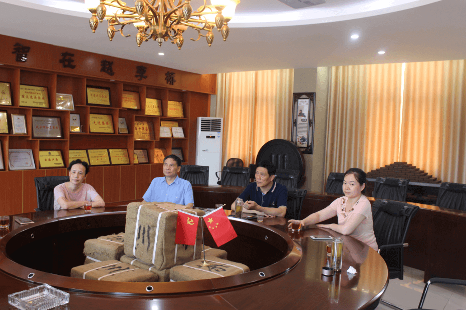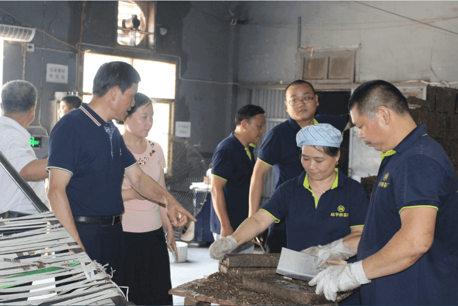 省直機(jī)關(guān)工委副書記于春利(左二)深入烘包車間了解情況,公司執(zhí)行董事李云(左三)陪同