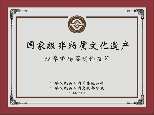 “趙李橋磚茶制作技藝”于2014年10月被錄入第四批國家級(jí)非物質(zhì)文化遺產(chǎn)代表性項(xiàng)目名錄。