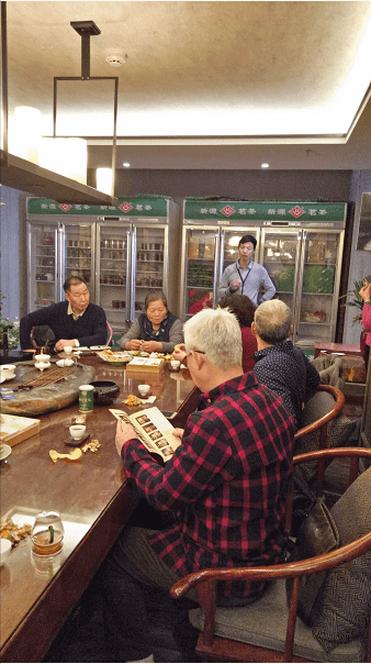 湖北省趙李橋茶廠武漢分公司銷售經(jīng)理彭壽軍(站立著)向大家介紹川字茶的歷史及功效