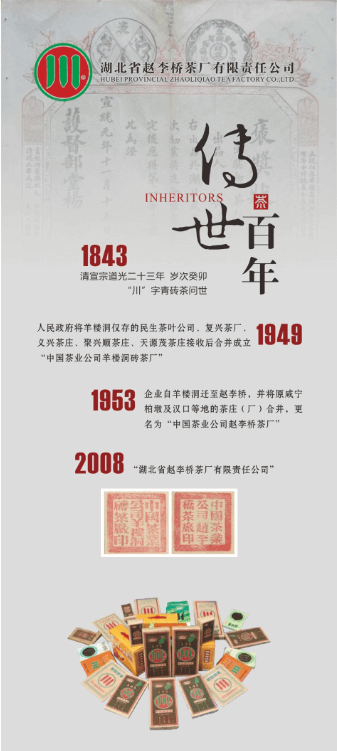 湖北省趙李橋茶廠有限責(zé)任公司,磚茶生產(chǎn)歷史悠久,源自唐、興于宋、盛于清,久負(fù)盛名。是擁有“中華老字號(hào)”和“中國(guó)馳名商標(biāo)”的省級(jí)農(nóng)業(yè)產(chǎn)業(yè)化龍頭企業(yè);“青磚茶”、“米磚茶”國(guó)家標(biāo)準(zhǔn)(GB)起草單位;歷史上聞名遐邇的“川”字茶唯一傳承者;國(guó)家級(jí)非物質(zhì)文化遺產(chǎn)趙李橋磚茶制作技藝唯一傳承保護(hù)單位;國(guó)家定點(diǎn)邊銷茶原料儲(chǔ)備單位。作為中國(guó)緊壓茶行業(yè)的重點(diǎn)生產(chǎn)企業(yè),茶廠年產(chǎn)量達(dá)萬(wàn)噸。旗下主要有“川”字牌青磚茶,“火車頭”牌、“牌坊”牌米磚茶等產(chǎn)品,暢銷內(nèi)蒙古、新疆、青海、寧夏、山西、山東、河北、北京、上海、廣州、香港等二十多個(gè)省市和地區(qū),遠(yuǎn)銷歐盟、俄羅斯、韓國(guó)、日本等十多個(gè)國(guó)家和地區(qū)。