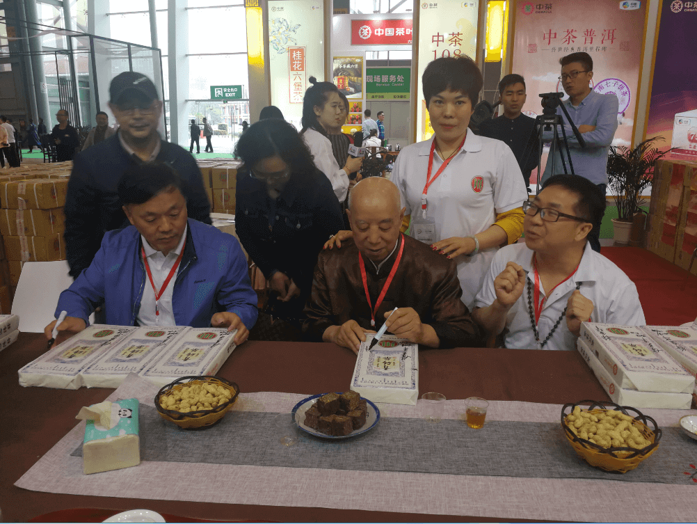 徐金華大師(右)與甘多平先生(左) 聯(lián)手簽名的青磚茶引燃了現(xiàn)場(chǎng)購(gòu)茶者的熱情