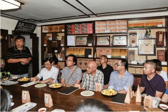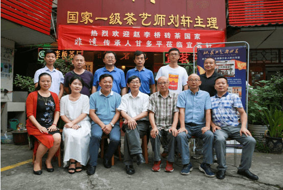 趙李橋磚茶制作技藝第四代代表性傳承人甘多平(前排左三)與品鑒會(huì)各位嘉賓合影