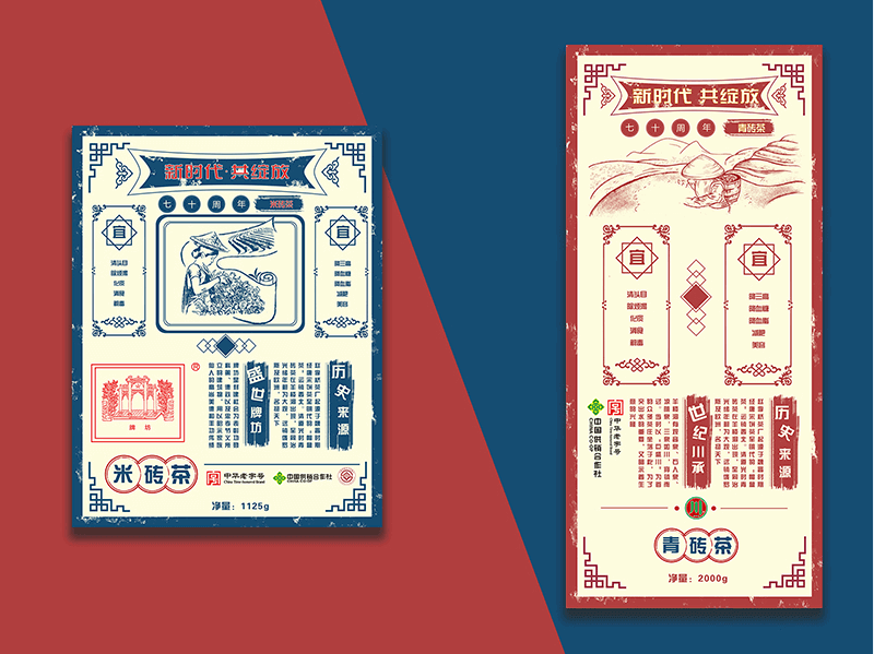 設(shè)計(jì)整體采用了民國風(fēng)海報(bào)的形式,整個(gè)畫面由不同板塊組合而成,此次包裝設(shè)計(jì)征集為獻(xiàn)禮建國70周年青(米)磚茶紀(jì)念版。在包裝的背面,通過每一個(gè)“川”字緊緊匯成一個(gè)面,寓意著趙李橋從往發(fā)展至今的每一次成長和壯大。