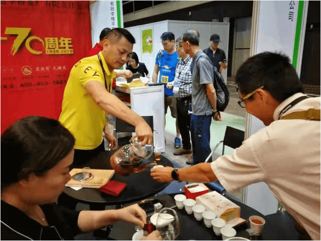 來自各國的客商駐足趙李橋茶廠展區(qū)了解湖北茶。