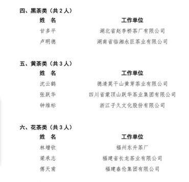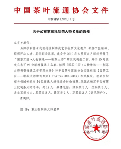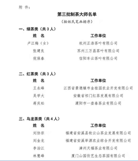 2017年以來,中國茶葉流通協(xié)會組織開展“國茶工匠——制茶大師”調(diào)查推選工作,相繼公布綠茶、紅茶、黑茶等各茶類制茶大師三個批次。