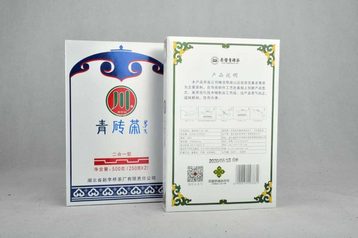 二合一型青磚茶是以精選鄂南山區(qū)優(yōu)質(zhì)低氟老青茶為主要原料,二合一型米磚茶以?xún)?yōu)質(zhì)紅茶為原料。該類(lèi)別產(chǎn)品為二合一顆粒型,小巧玲瓏,取飲便捷,香氣純正,滋味醇和,湯色紅濃。