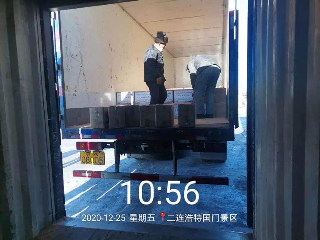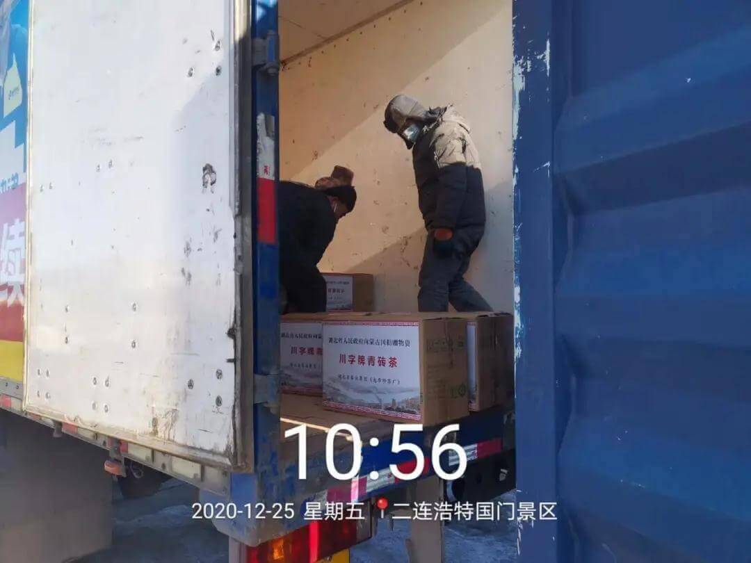 12月24日下午,由德邦物流運(yùn)輸?shù)?萬片趙李橋茶廠川字牌青磚茶首先抵達(dá)二連浩特。一輛“打著封條”的物流車裝載著湖北捐贈給蒙古國的3萬片“川”字牌青磚茶生活物資,經(jīng)過2天近2000公里的行程,順利抵達(dá)內(nèi)蒙古二連浩特市,貨車上“湖北省人民政府捐贈蒙古國生活物資”的條幅,承載著湖北人民對蒙古國人民的深情厚意和牽掛,在零下20多度的嚴(yán)寒中讓人感覺格外溫暖。