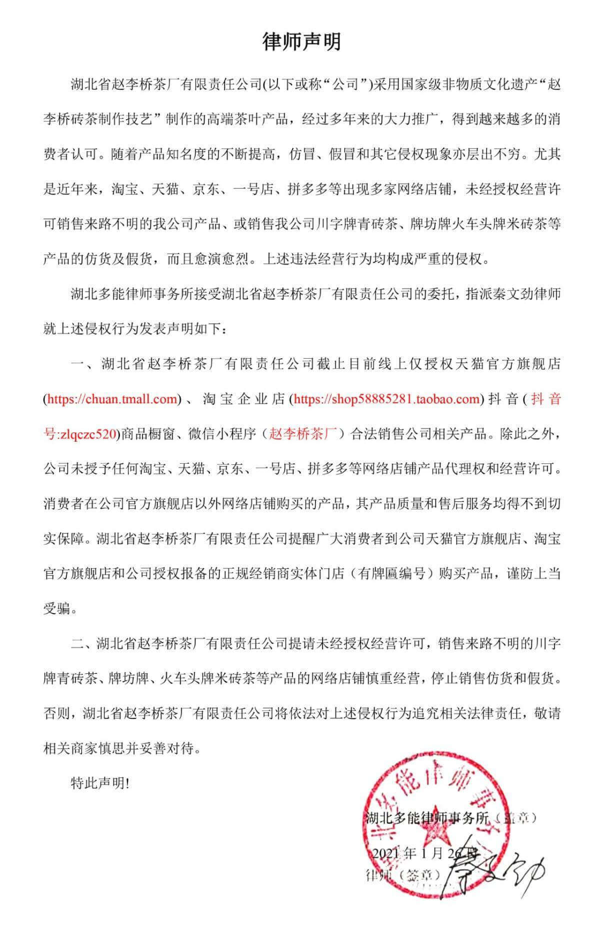 湖北多能律師事務(wù)所接受湖北省趙李橋茶廠有限責(zé)任公司的委托,指派秦文勁律師就上述侵權(quán)行為發(fā)表聲明如下:
