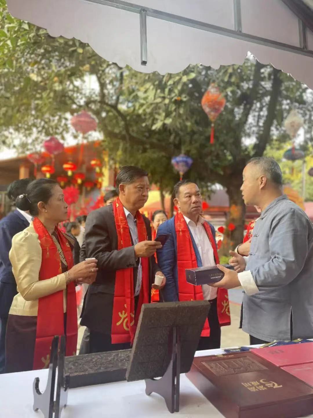 向老撾人民革命黨中央宣傳部副部長、《人民報》總編輯萬賽·達溫雅贈送涓滴成川75周年紀念米磚茶
