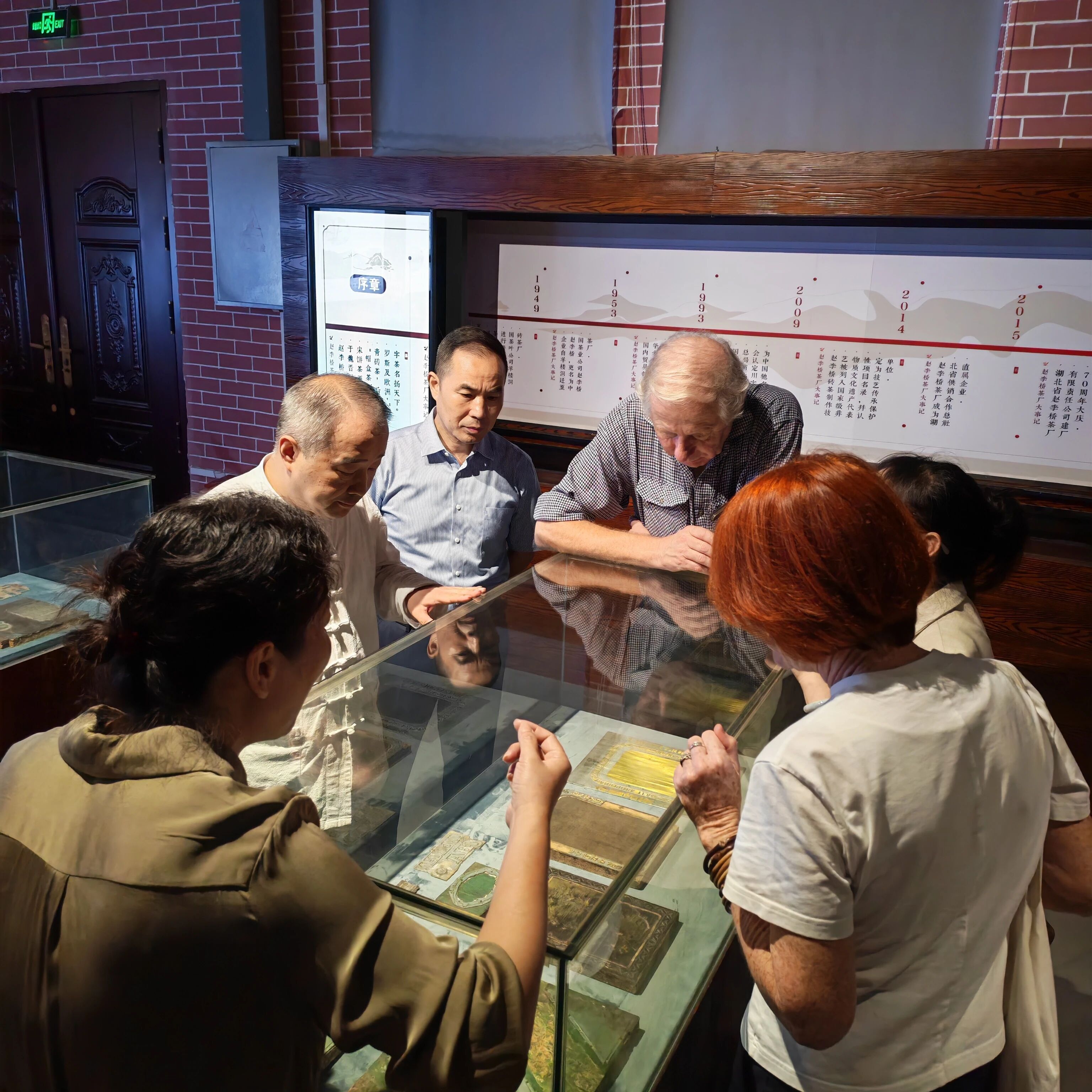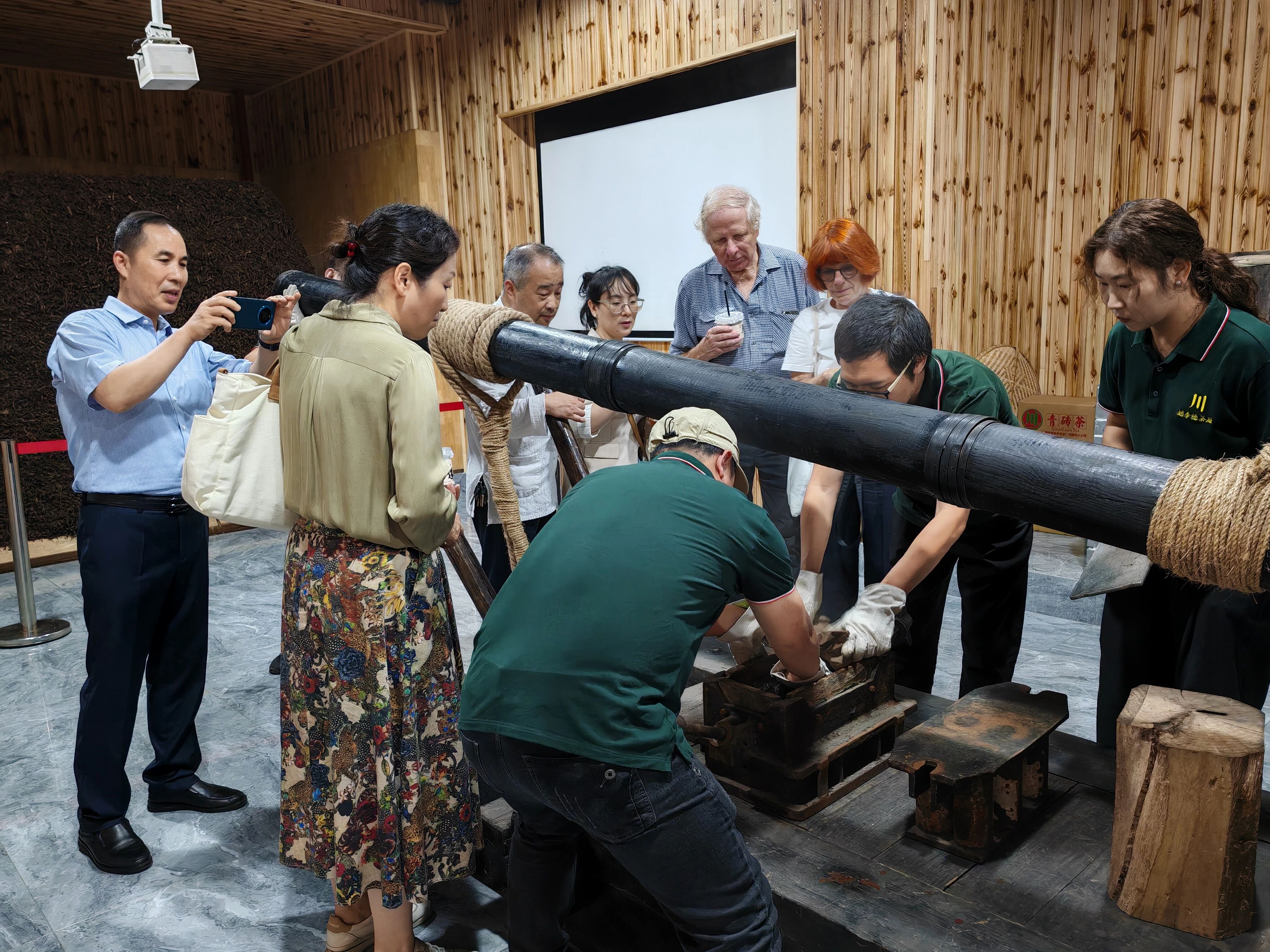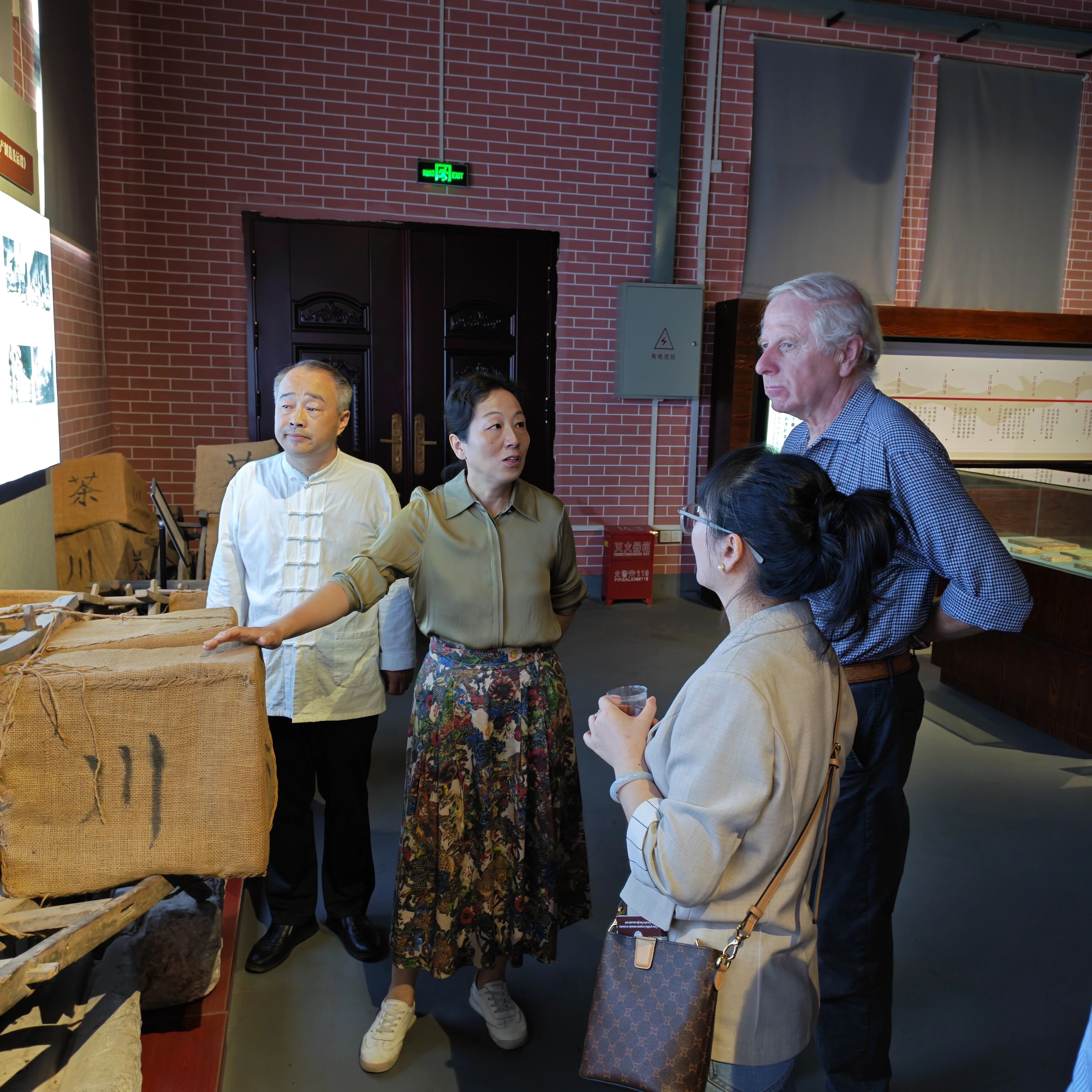 隨后,一行人移步至“川字茶博物館”。館內,歷經(jīng)歲月沉淀的老茶樣、古樸的制茶工具與珍貴的泛黃文獻,共同構成了一部濃縮的川字牌百年史。在宋慧宇主席、金莉董事長及非遺傳承人陳軍海的接力講解下,一幅波瀾壯闊的“萬里茶道”歷史畫卷徐徐展開。宋慧宇主席從赤壁青磚茶產業(yè)的宏觀視角切入,金莉董事長深入闡釋“川字牌”的品牌內核,而陳軍海傳承人則以生動的軼事與專業(yè)的工藝解讀,串聯(lián)起青磚茶作為“萬里茶道”核心載體的輝煌脈絡。國際嘉賓們聽得入神,頻頻點頭,對中國青磚茶文化的深厚底蘊與獨特魅力有了更為立體和深刻的認知。