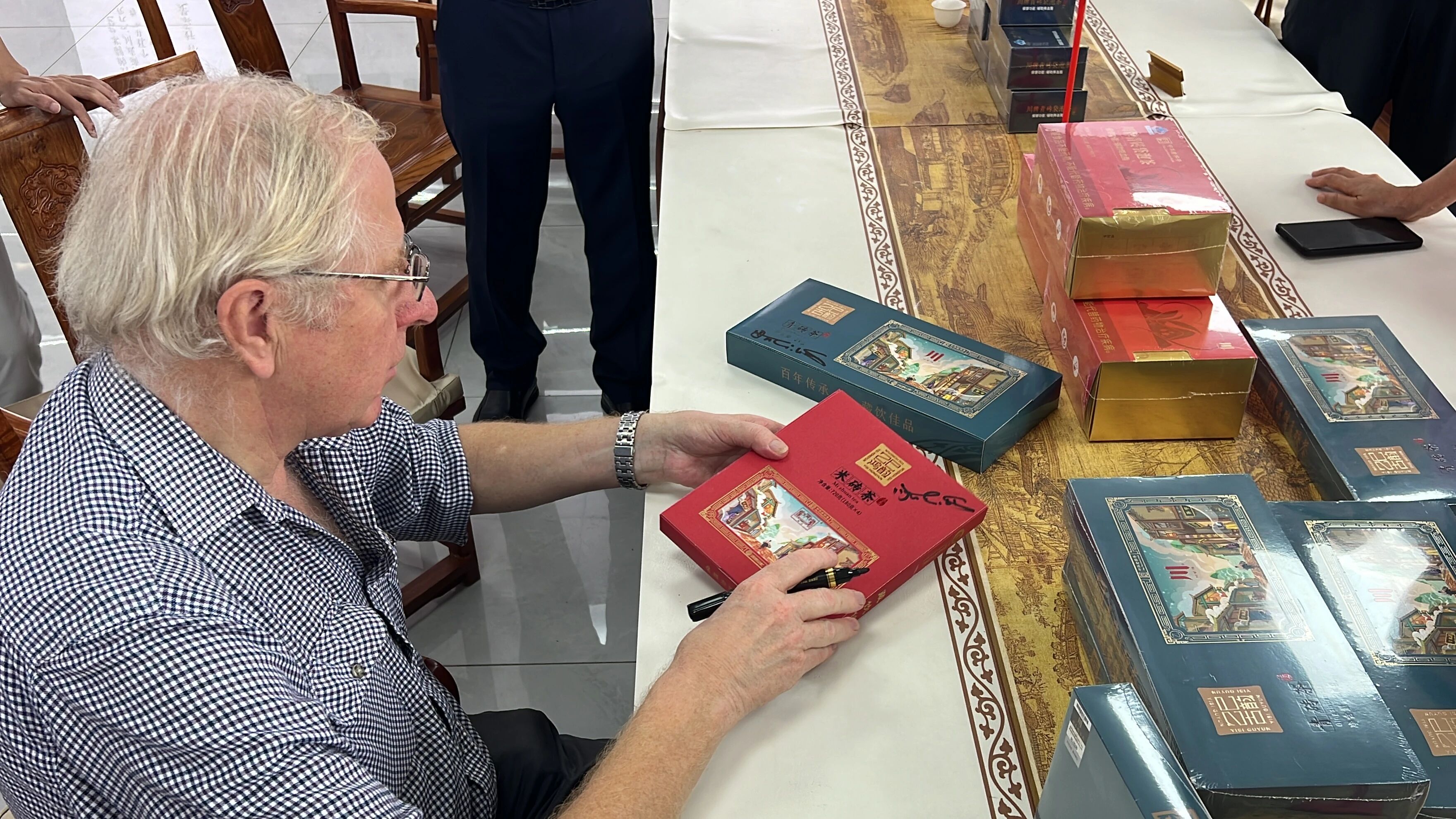 在營銷中心,一個多元化的產品矩陣令人耳目一新。從經(jīng)典的緊壓茶磚到便捷的袋泡茶,再到新潮的茶食品,趙李橋茶廠展現(xiàn)了其強大的市場適應力與創(chuàng)新活力。伊恩?吉布斯主席在親手端詳茶餅后由衷贊嘆:“趙李橋茶廠既守護傳統(tǒng)工藝,又讓青磚茶適配現(xiàn)代需求,為中國茶出海提供了好思路。