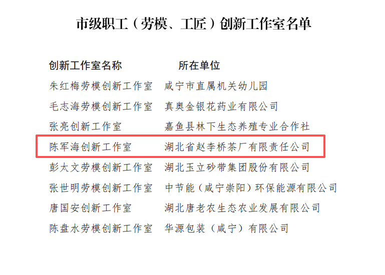 趙李橋茶廠代表性傳承人陳軍海創(chuàng)新工作室獲評咸寧市職工(勞模、工匠)創(chuàng)新工作室