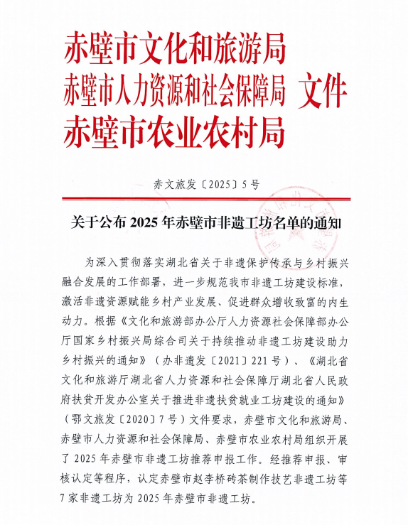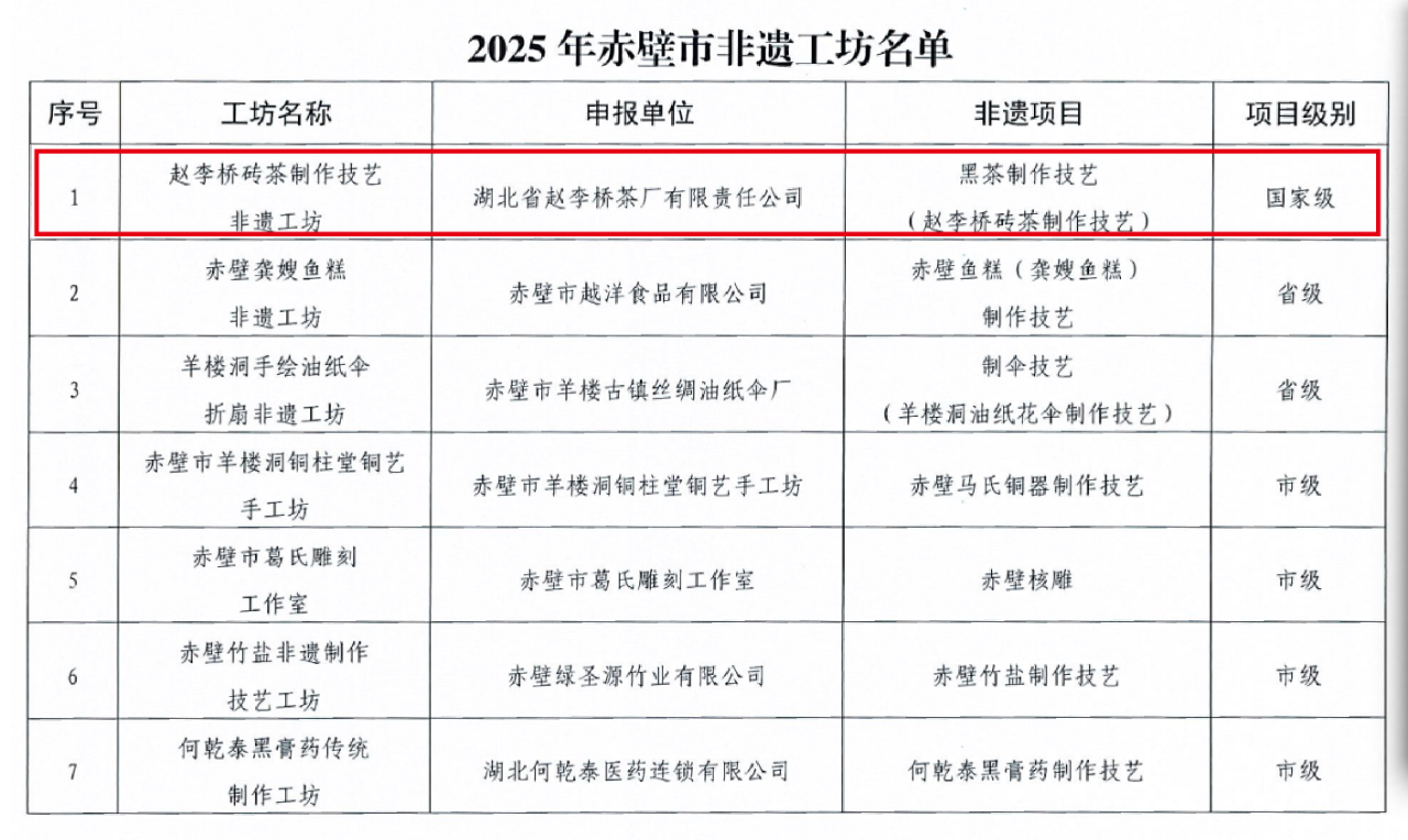 近日,赤壁市文化和旅游局、赤壁市人力資源和社會(huì)保障局、赤壁市農(nóng)業(yè)農(nóng)村局聯(lián)合發(fā)布《關(guān)于公布2025年赤壁市非遺工坊名單的通知》(赤文旅發(fā) [2025]5號(hào)),湖北省趙李橋茶廠有限責(zé)任公司申報(bào)的 “趙李橋磚茶制作技藝非遺工坊”憑借深厚的文化底蘊(yùn)、精湛的傳統(tǒng)技藝及顯著的產(chǎn)業(yè)帶動(dòng)作用,成功入選2025年赤壁市非遺工坊名單!